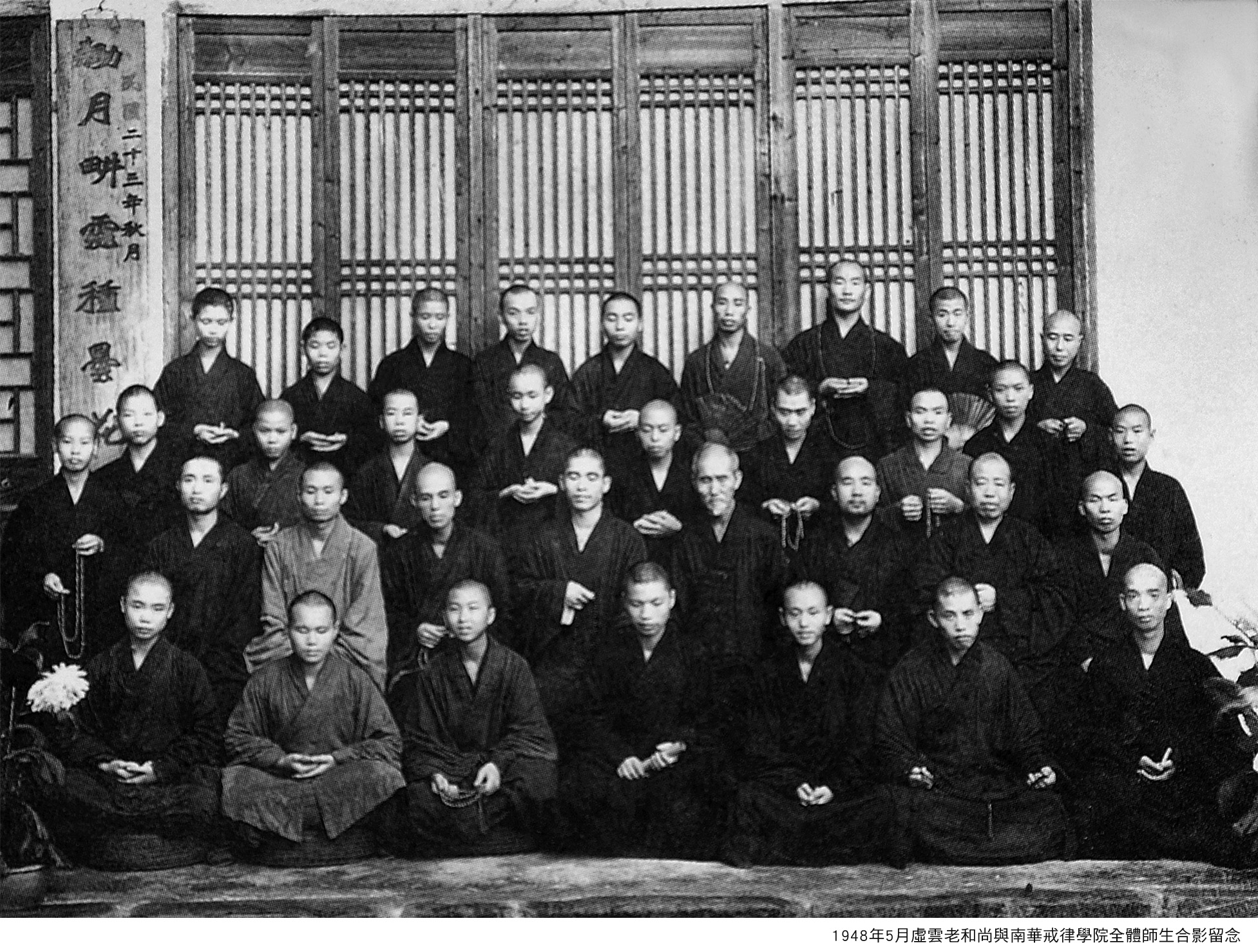 The Second World War finished and the government offices returned to their original places. That spring I transmitted the precepts and read sutras as usual. That autumn all monasteries were ordered by the central government to hold remembrance ceremonies for the war dead. Then, in November, as a response to an invitation, I also held a similar ceremony at the Six Banyans monastery. During the ceremony some peach trees there suddenly came into flower. There were over 100,000 people there who witnessed this out-of-season flowering of the trees. Upasika Zeng Bishan embroidered the scene with the Buddha and peach blossom, and Upasika Hu Yisheng painted a picture of the peach flowers to commemorate the auspicious event. Official and important people from Chaizhou and Shantou then invited me to lecture on the Buddha’s teachings at Chauzhou’s Kai Yuan monastery. There, many people came to receive the Buddhist precepts. Then, my top student, Contemplating Root, passed away that November.
